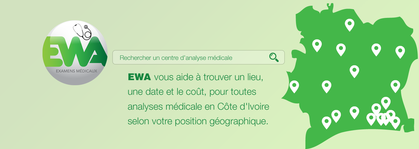 Ewa vous aide à trouver un lieu, une date et le coût pour toute analyse médicale en Côte d'Ivoire selon votre position géographique.
